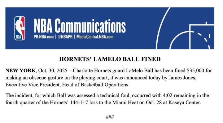 北京时间10月31日,新赛季NBA常规赛继续进行。在今天早些时候,NBA官方宣布,黄蜂队球星拉梅洛-鲍尔对裁判比不文明手势,被罚3.5万美元,这也是新赛季NBA常规赛首笔罚单。